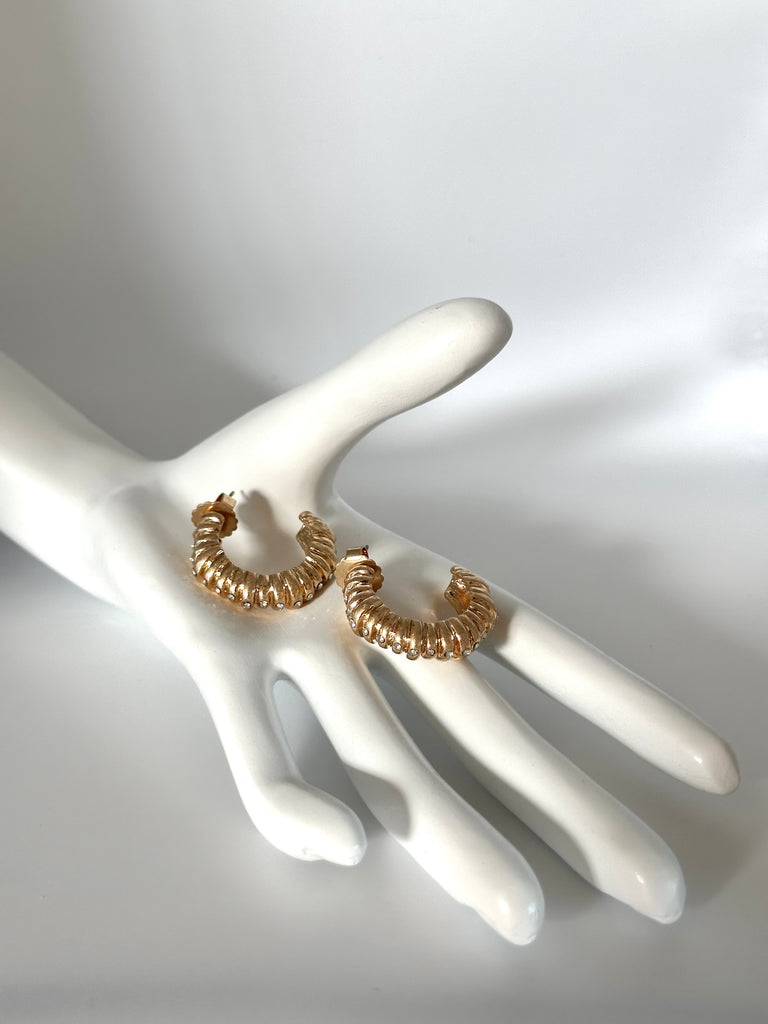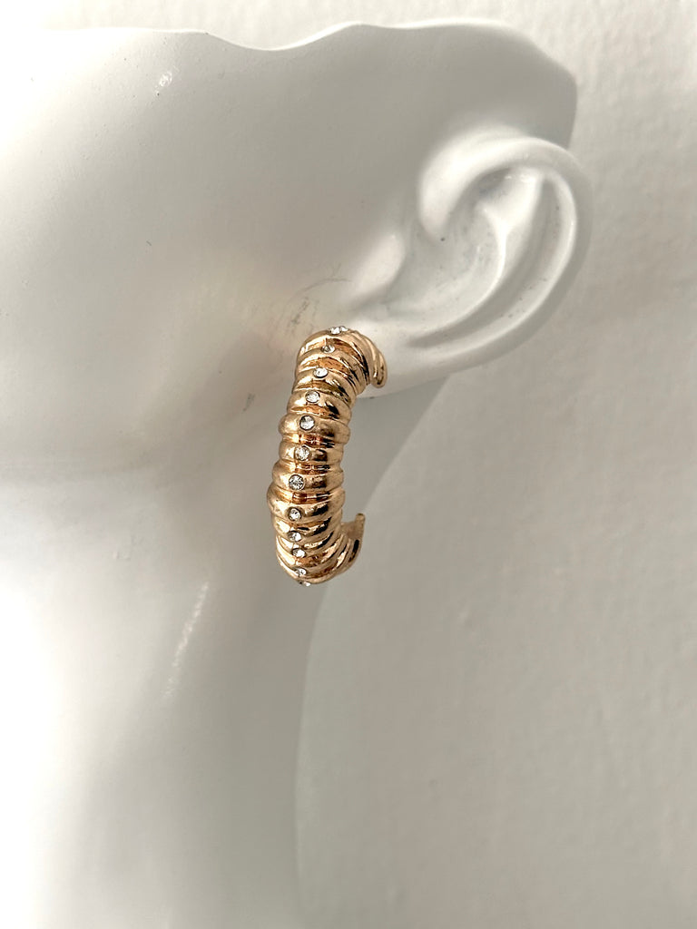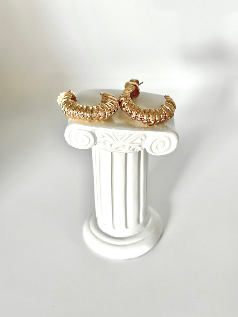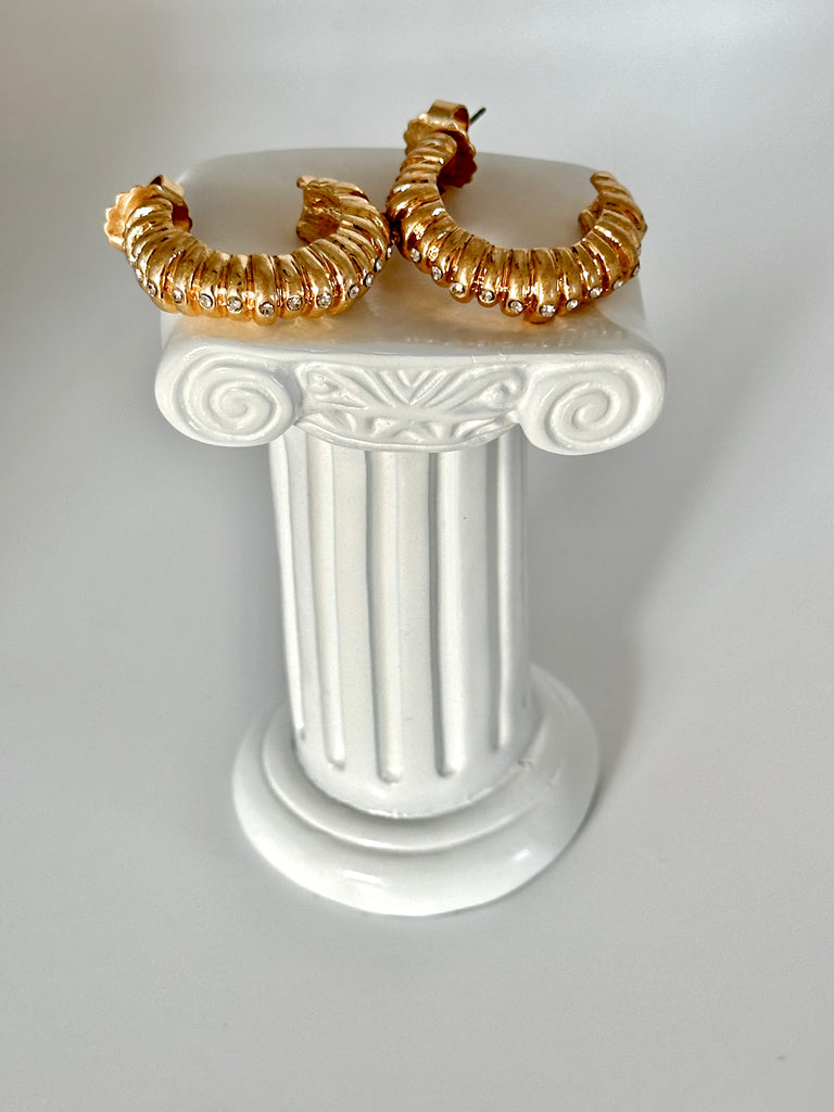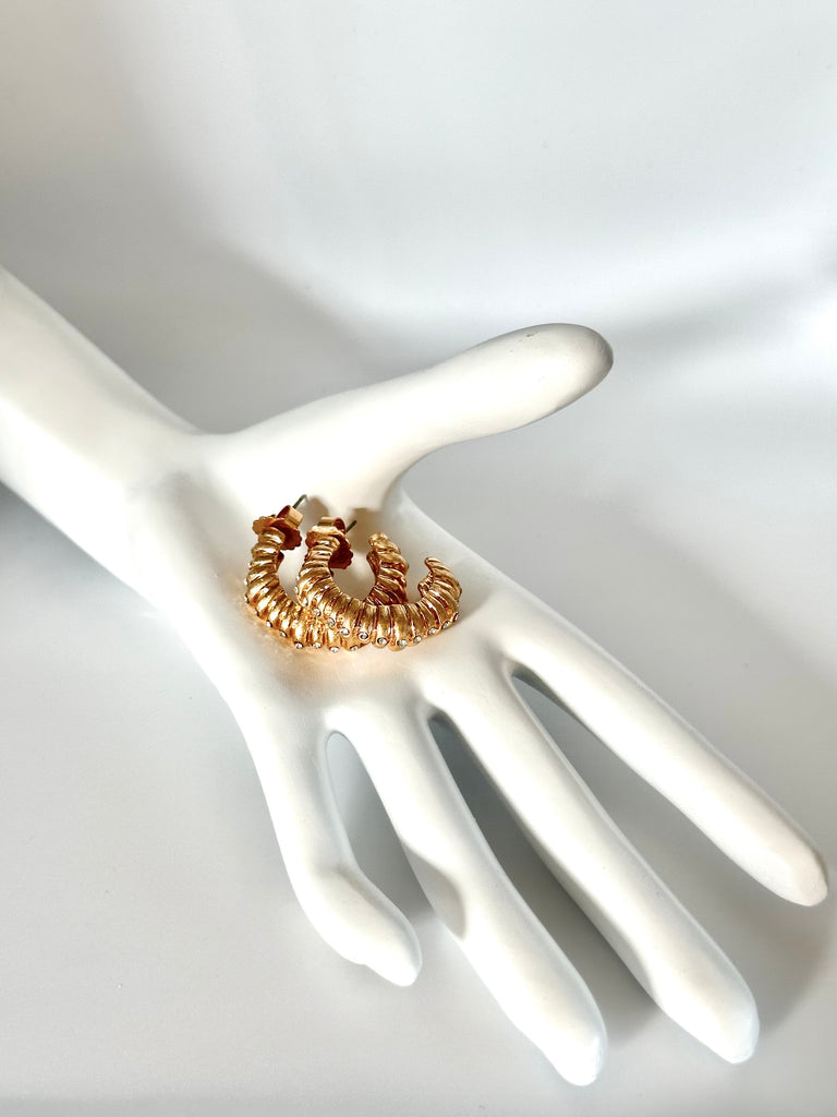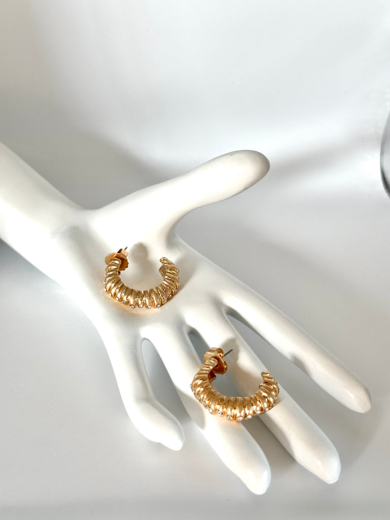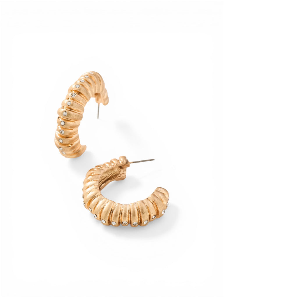 Bold but easy to wear, these gold hoops are designed to catch the light from every angle. The soft ribbed texture and tiny crystal details give them just the right amount of sparkle without trying too hard.